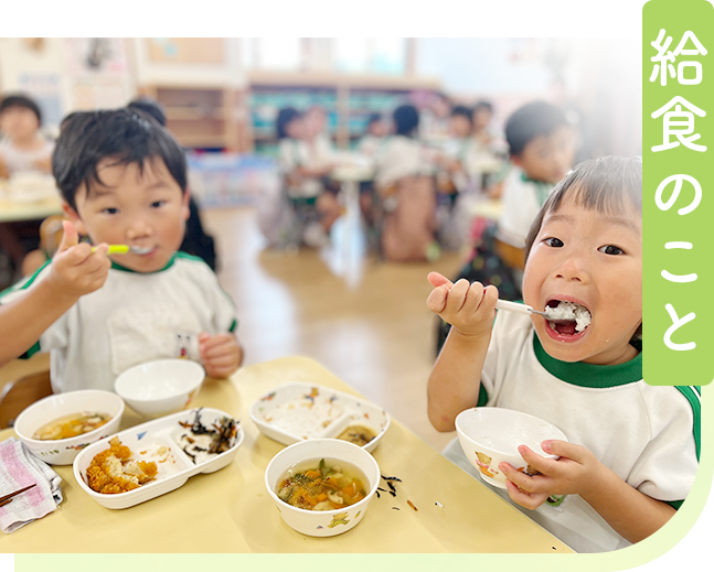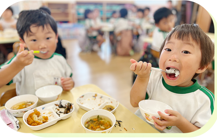 地元の旬の食材を取り入れた完全給食を提供しています。行事食や菜園活動、クッキング保育などの体験を通して食の楽しさを伝えながら、興味関心を育んでいます。